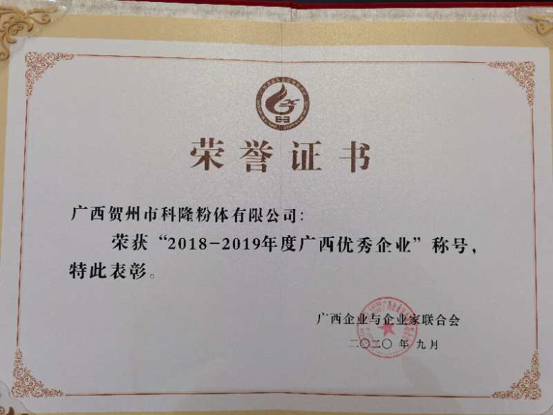 這次活動宣讀了《關于表彰2018—2019年度廣西優(yōu)秀企業(yè)的決定》,廣西賀州市科隆粉體有限公司等100家企業(yè)被授予“2018—2019年度廣西優(yōu)秀企業(yè)”稱號,這是政府部門對科隆公司的肯定,也是廣大客戶及社會各界人士對科隆公司持之以恒關心和支持的結果。