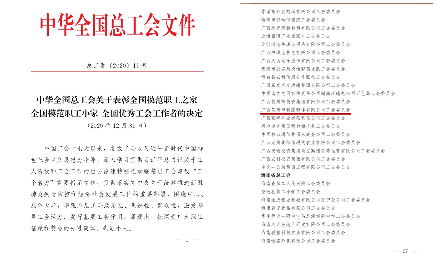 近日,廣西賀州市科隆粉體有限公司工會委員會獲中華全國總工會表彰,并被授予“全國模范職工之家”榮譽稱號。該稱號是全國工會系統(tǒng)表彰先進(jìn)集體的最高榮譽,也是國家對基層工會工作的最高褒獎。